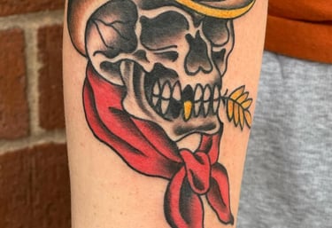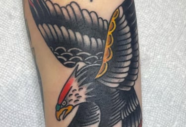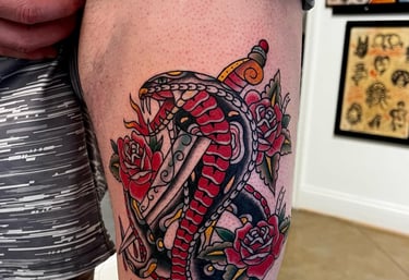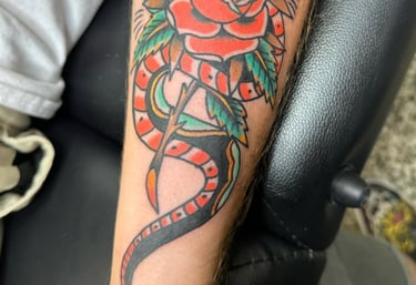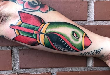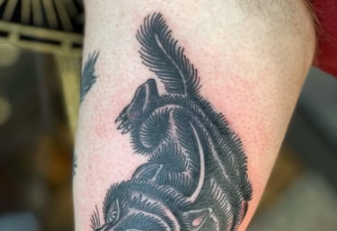 Meet Mark Mitchell — a standout artist at Have Heart Tattoo in Charlottesville. As his IG handle "heavy on the black" states, Mark specializes in classic-style, bold line work and rich illustrative color pieces, while also excelling in fine-line black and grey tattoos that carry subtle depth and striking contrast. With an eye for dynamic composition and a steady hand for clean execution, he brings unique ideas to life with both precision and flair. Whether you’re dreaming of a full-color statement piece or a delicately shaded black-and-grey design, Mark’s work has you covered.
